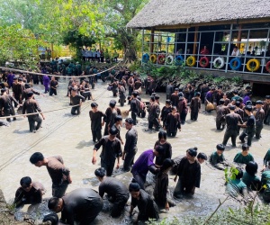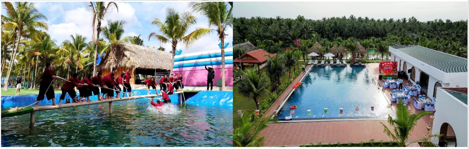 - 13h: Quản trò của khu du lịch đón đoàn, hướng dẫn đoàn ổn định vị trí, nhận đồ bà ba trang phục truyền thống của Nam Bộ, đoàn tập trung tại sân Team của khu du lịch, tham gia các hoạt động: