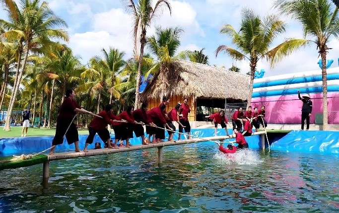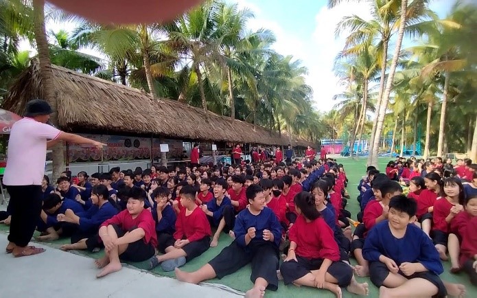 Quản trò của khu du lịch đón đoàn, hướng dẫn đoàn ổn định vị trí, nhận đồ bà ba trang phục truyền thống của Nam Bộ, đoàn tập trung tại sân Team của khu du lịch, tham gia các hoạt động: